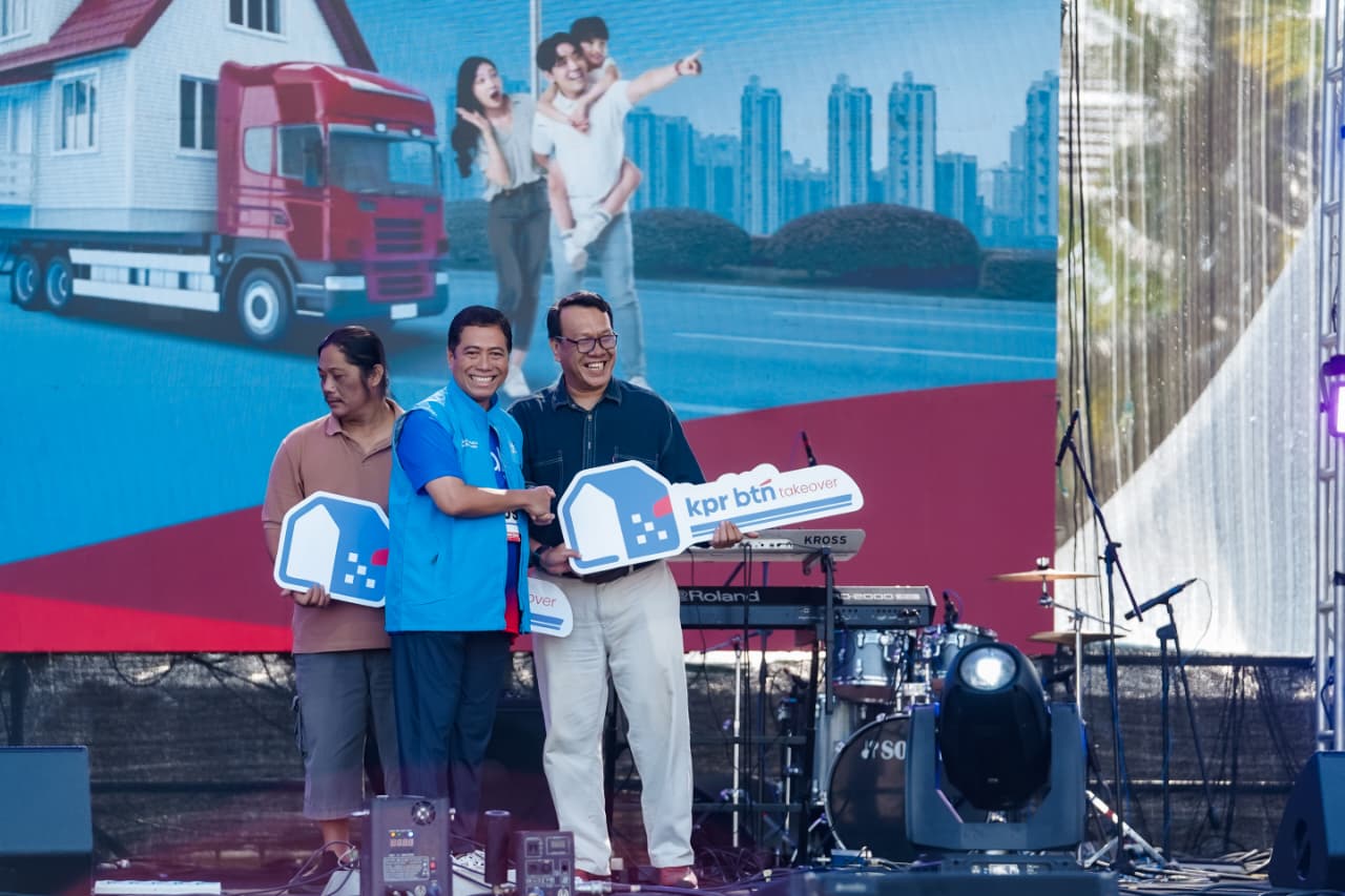 Direktur Consumer Banking PT Bank Tabungan Negara (Persero) Tbk (BTN) Hirwandi Gafar (tengah) secara simbolis menyerahkan mock up kunci rumah kepada debitur KPR BTN Take Over didampingi Kepala Divisi Mortgage & Secured Loan Division (MSLD) Bagus Hadriansyah (kiri) dalam rangkaian BTN Run 2026 for Charity di Beach City International Stadium (BCIS) Ancol, Jakarta (29/3).